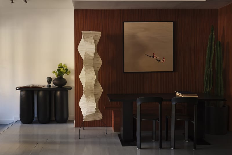In their living room, another piece by Theo Pinto came directly from the West Village location. Below it, a wooden chair by New York-based studio Monolith was recently transferred from the Greenpoint branch. This fluid exchange imbues Alex and Ivana’s apartment with the eclectic energy of a showroom while giving Rhythm Zero the cozy feel of home.