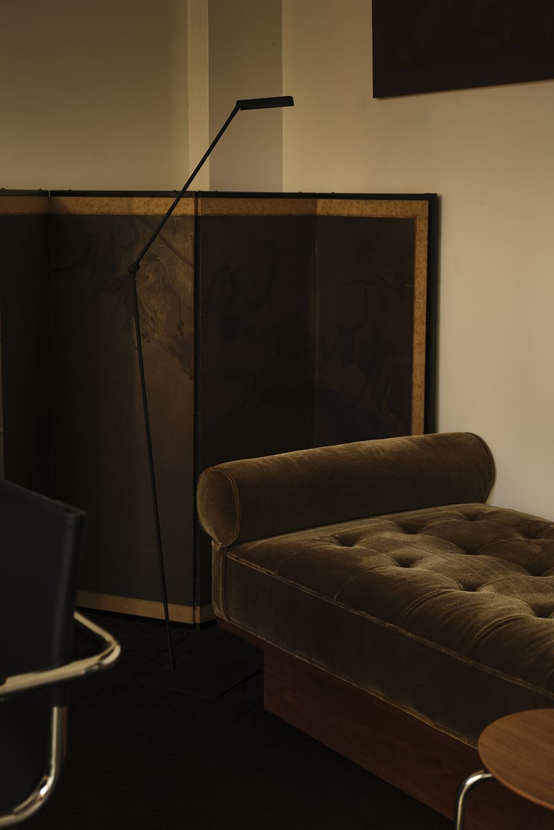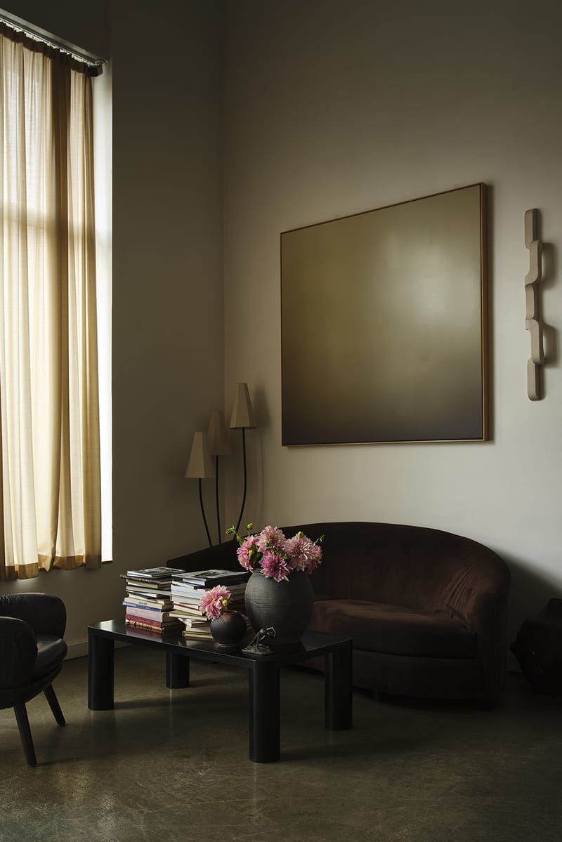 Across from the centuries-old Rembrandt sits a contemporary piece by artist Theo Pinto, whose studio is just around the corner. Pinto’s striking gradient canvas is flanked by the travertine Serpentine Sconce by Farrah Sit, who happens to live in the neighborhood. Along the back wall, a chaise by designer Athena Calderone — who resides in Cobble Hill —is arranged beside an antique folding screen. One doesn’t need to know the full roster to understand that local is king here.