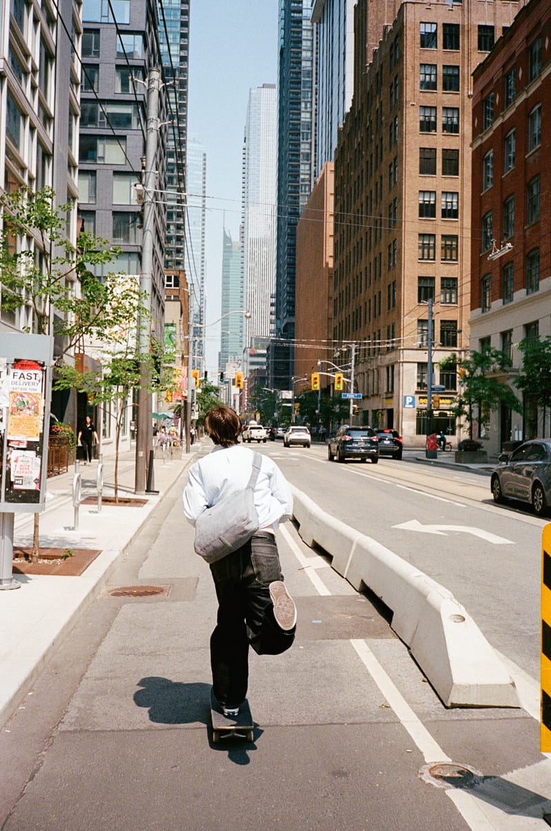 Also, CBC isn’t a spot that I really like to skate, but you don’t get kicked out, so that was a huge factor. There’s also this big Anish Kapoor sculpture in the back called “Mountain” that’s sort of staring at the CN Tower, like mimicking it almost. I thought, “Oh, if we skate there and attach the GoPro, we could give this sculpture the eyes and reflect the point back onto the plaza. Maybe that would be interesting.” Once you lock the location, it’s really just figuring out what else you can do to make a skate video worthwhile.