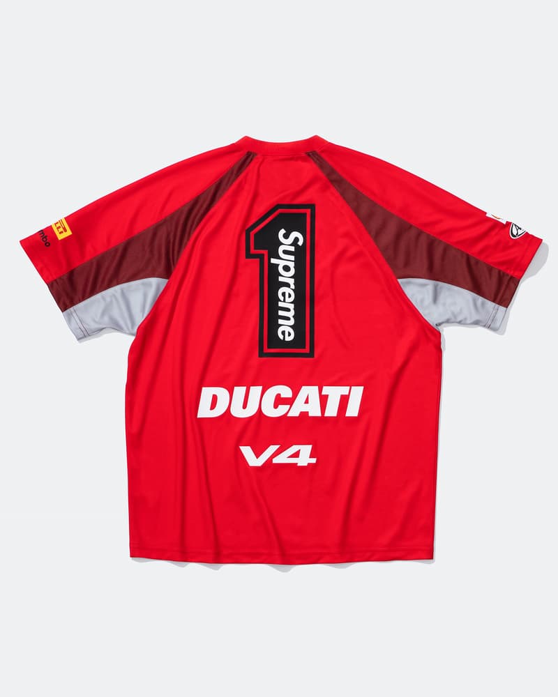 本週 Supreme 迎來了 Ducati Performance 的重磅合作!緊接著第一輪 Performance 系列的專業賽車裝備,Supreme 還與 Ducati 和 Aldo Drudi 合作帶來偏日常的服飾系列單品,其中包括賽車夾克、足球衫、運動褲、兩件 T-Shirt 和 6 片帽 。